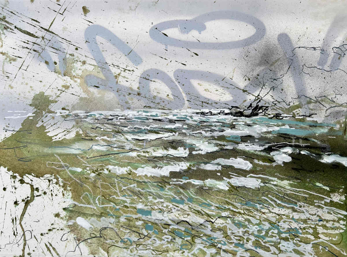 Spray-Paint, Chalk, Watercolour Pencil, Acrylic Paint & Pen on Arches Aquarelle, Deckle-Edged 640gsm Watercolour Sheet